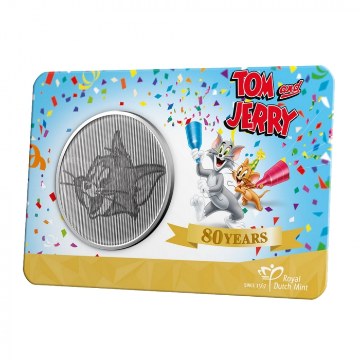 Warner Bros, Tom and Jerry 80 Years collectible medal issued by the Royal Dutch Mint. Universal Brilliant 33mm medal (BU). The happily colored coincard represents the terrible duo, two illustrations on the obverse. They only appear from a particular angle. Limited edition of 5000 copies.
