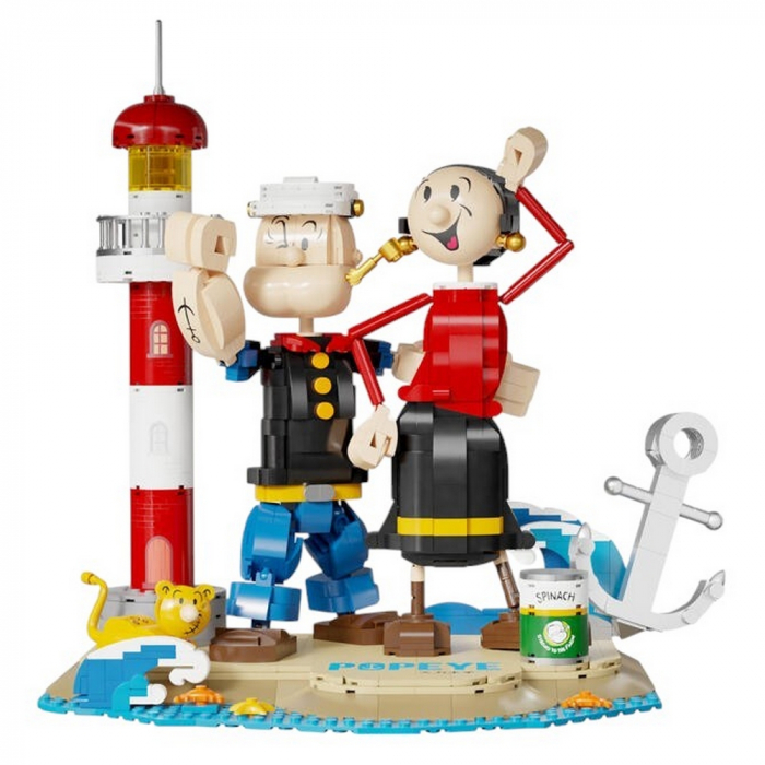 Construction set Popeye: Popeye and Olive Oyl. Created by Pantasy. The set consists of 1500 pieces and takes approximately 5 hours to assemble. The recommended minimum age is 6 years old. User manual included. Height: 33cm.
