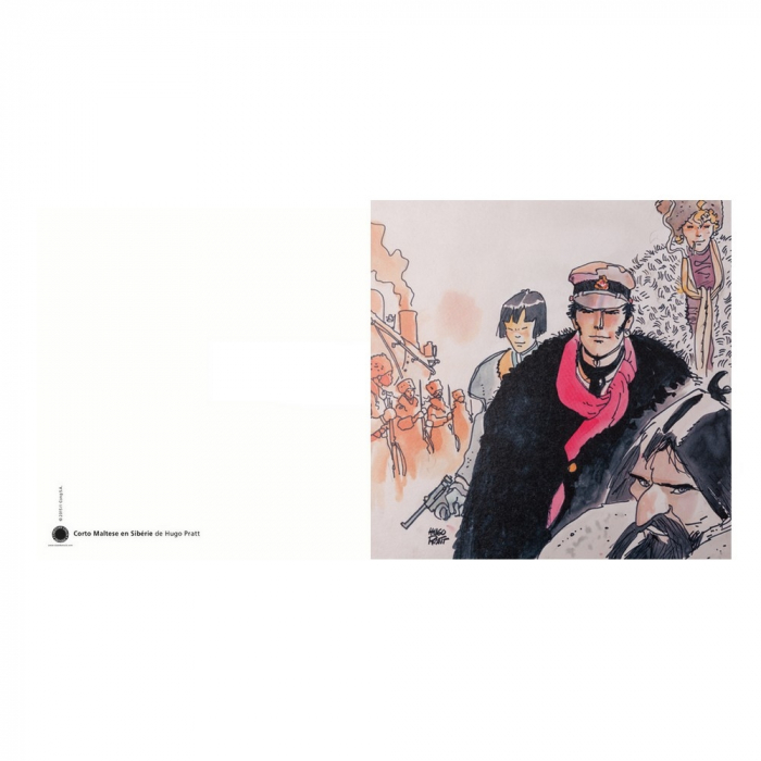 Double Postcard of Corto Maltese, Sibérie. Illustrated by Hugo Pratt. 14x14cm.