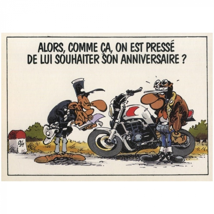 Collectible postcard published by the Lucane company in 1996, Bar2 Fane Joe Bar Team: Alors, comme ça, on est pressé de lui souhaiter son anniversaire ? Dimensions: 10x15cm.