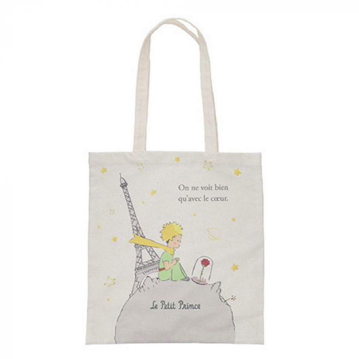 Cotton canvas Totebag Kiub The Little Prince: The Little Prince sitting on his planet with the Rose and Eiffel Tower. Dimensions: 37x10x40cm.