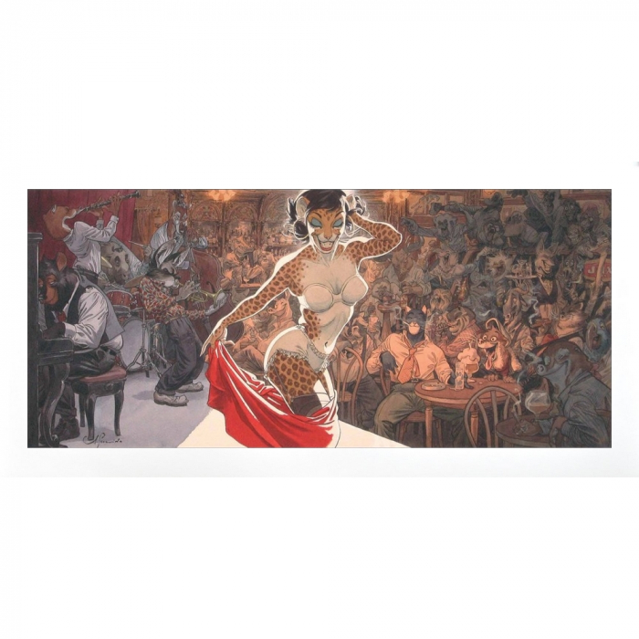 This art pigment print poster derived from Juanjo Guarnido's Blacksad comic book is printed on a Innova 210g paper. Limited edition and numbered 500 copies with certificate of authenticity. 60x30cm. Jazz n' Fun's Club.