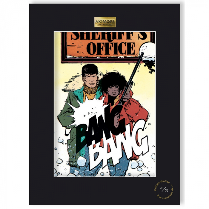 This art offset poster derived XIII comic FROM William Vance and Jean Van Hamme, book is printed on a thick art paper Conquéror Connoisseur 100% coton / 315g. Each copy is framed in a black Marie-Louise adorned with an Akimoff Collections pewter plaque. Limited edition and numbered 99 copies. Dimensions: 30x40cm. Bang Bang.