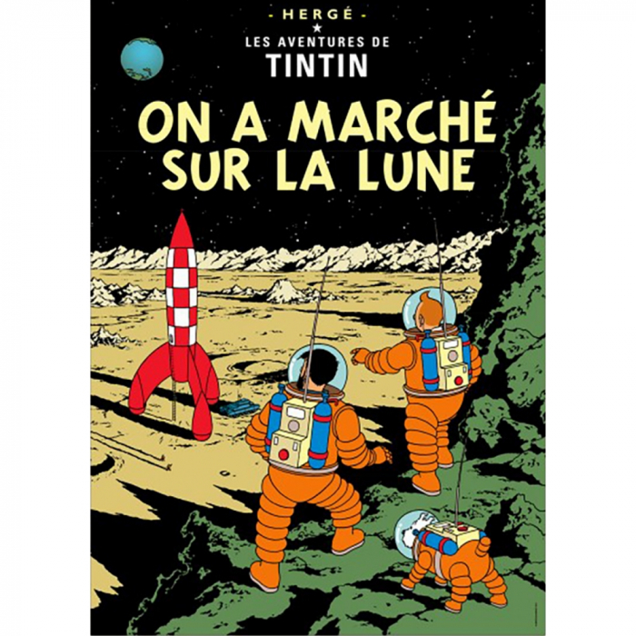 This poster represents the original album cover of Tintin in French: On a marché sur la Lune.
