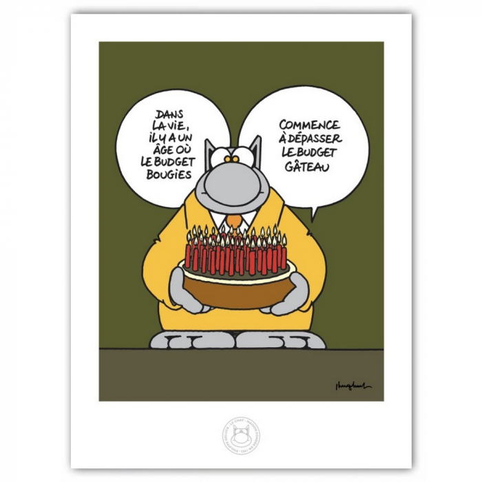 Handmade screen printing Le Chat de Philippe Geluck: Anniversaire. Philippe Geluck's signature is printed. 3D stamp of the Cat at the bottom of the print. Dimensions: 30x40cm.