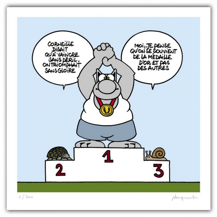 Handmade screen printed in Brussels and made on fine art paper hahnemühle 308g. 9 color passages. Le Chat de Philippe Geluck: Gold Medal. Limited edition of 200 copies, numbered and signed in pencil by Philippe Geluck. Dimensions: 50x50cm.