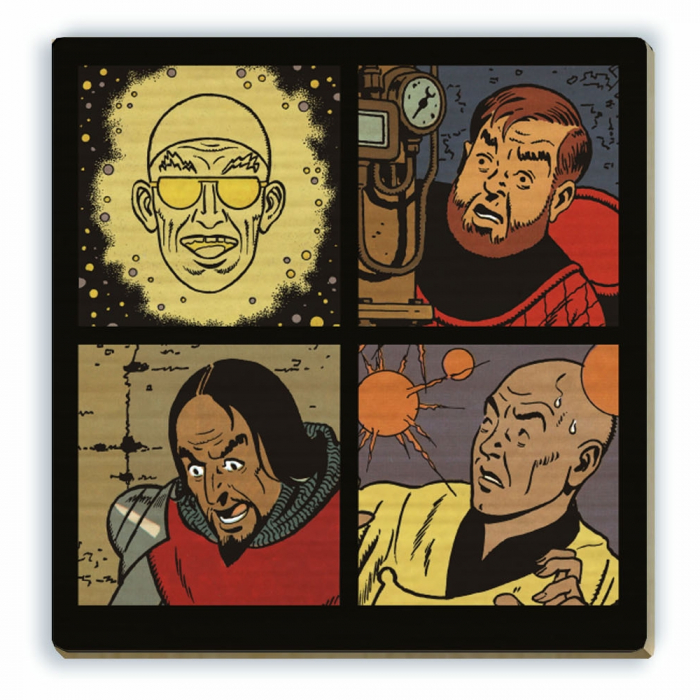 Cuadro de madera de arce del fabricante Akimoff, Blake y Mortimer del álbum La Trampa Diabólica: Miloch, Mortimer, Focas y Sire Gui. Los personajes principales. Serie limitada a 59 ejemplares y numerada a mano de 1 a 59.