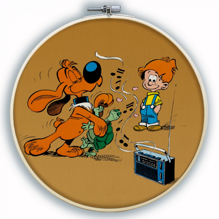 Este lienzo ilustrado montado en un aro de bambú derivado de la tira cómica Boule et Bill de Jean Roba está impreso en un lienzo con aspecto de algodón de calidad 316 g/m2. Cada copia está enmarcada en un aro de bambú. Edición limitada y numerada a 59 ejemplares. Dimensiones: 20cm de diámetro. Bailando.