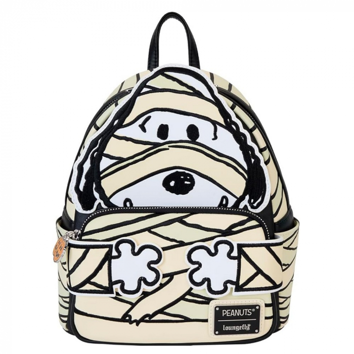 Mini Mochila de colección Loungefly Peanuts, Snoopy: Momia. Vestido como una momia, Snoopy luce un disfraz festivo para una divertida noche de Halloween. Atenúa las luces para ver su disfraz brillar en la oscuridad. Dimensiones: 22,7x11,4x26,7cm.
