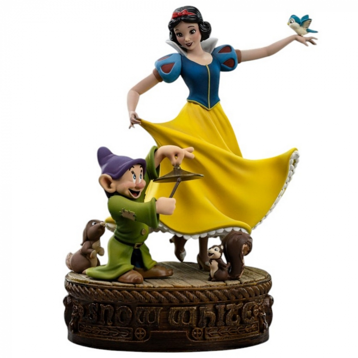 Figura de colección Iron Studios 1/10 Art Scale. Blancanieves baila alrededor de su amigo enano Tontín mientras un pájaro azul, un conejo y una ardilla la observan. Edición limitada. Figura pintada a mano. Polystone. Altura: 21,4cm.