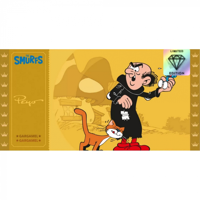 Billete de colección CK Los Pitufos: Gargamel y Azraël. Producto oficial de Cartoon Kingdom. Edición limitada a 1000 unidades. Cada billete está cuidadosamente impreso en alta definición en papel de PVC lavable a prueba de rasgaduras y cubierto con una fina capa dorada muy brillante. Dimensiones: 14,5x7,5cm.