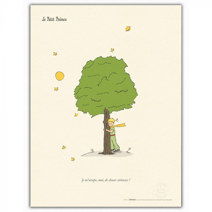 Impresión de arte oficial impresa en papel verjurado color crema de 220g. Cuadro no proporcionado. Sello seco en la parte inferior derecha que da fe de su autenticidad. Impreso en Francia. Reproducción de una ilustración de la obra de Antoine de Saint-Exupéry: El Principito y el árbol.
