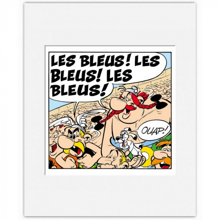 Impresión de arte oficial impresa en papel artístico Epson Cold Press Natural 300gr/m² con paspartú 1,5 mm. Edición limitada y numerada de 500 ejemplares con certificado de autenticidad. Astérix y Obélix Les Bleus ! Les Bleus ! Les Bleus ! Dimensiones: 40x50cm.