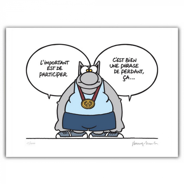 Serigrafía original impresa en Bruselas y producida en papel fine art Arches BFK rives, 100% algodón, sin ácidos, 250g. 9 pasajes de colores. El Gato de Philippe Geluck: l'important c'est de participer. Edición limitada a 400 ejemplares numerados y firmados al lápiz por Philippe Geluck. Dimensiones: 50x40cm.