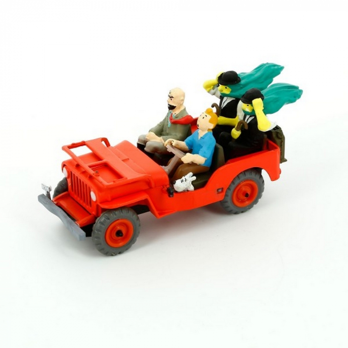 Coche de Tintin de metal en escala 1/43. Jeep de Tintín en el país del oro negro. El conductor es Tintín y los pasajeros Milú, Muller, Hernández y Fernández.