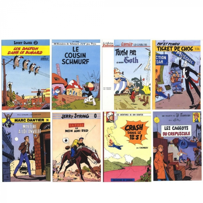 Ces cartes postales font partie du portfolio Les nouveaux introuvables tiré à 1500 exemplaire numérotés et signés. il sagit ici de la série des 8 cartes avec le Portfolio numéroté et signé. Hommage à Tillieux, Morris, Eddy Paape, Peyo, Uderzo, Will & Rosy, Jijé, Weinberg et à leurs personnages par A. Folc'h. Dimensions de chaque carte postale: 10x15cm.