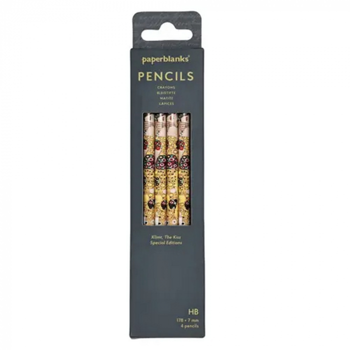 Set de 4 crayons à papier en bois de la marque Paperblanks: Gustav Klimt, Le Baiser. Crayons #2HB de haute qualité. Bois de couleur noire certifié FSC. Longueur des crayons: 17,8cm.