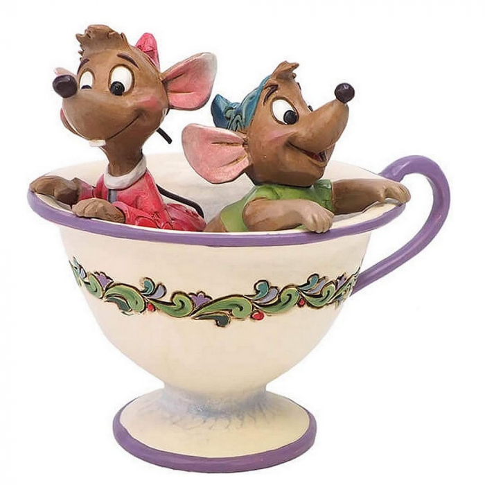 Figurine en résine Disney Traditions, Cendrillon: Jaq et Gus. Jaq et Gus regardent par-dessus la tasse de thé de Lady Tremaine alors qu'ils élaborent un plan pour voler la clé dont ils ont besoin pour libérer Cendrillon. Conçue par le sculpteur primé Jim Shore pour Disney Traditions, la figurine est fabriquée à partir de poudre de pierre et peinte à la main. Hauteur: 12cm.