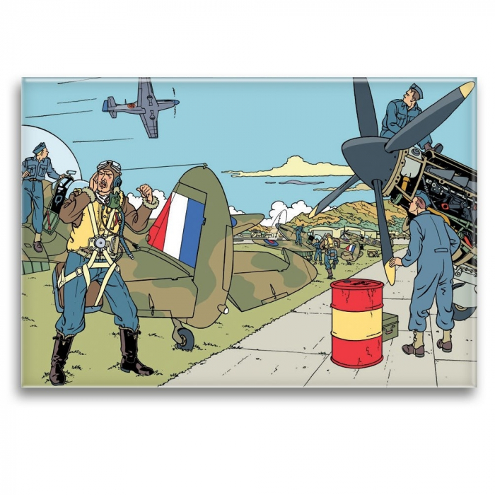 Aimant décoratif rectangulaire de l'album Blake et Mortimer: La vallée des immortels, attaque sur le tarmac. 79x55mm.