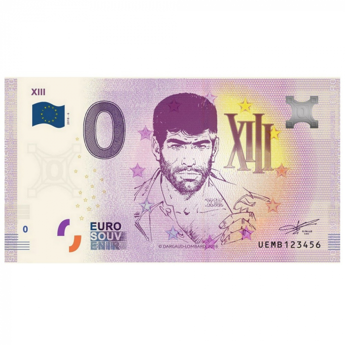 Ce billet commémoratif de 0€ est un billet de banque en tirage limité. Il s'agit d'un billet de XIII de la collection de billet Euro Souvenir à l'éffigie des héros de la bande déssinée européenne. Edition limitée et numérotée à 5000 exemplaires.