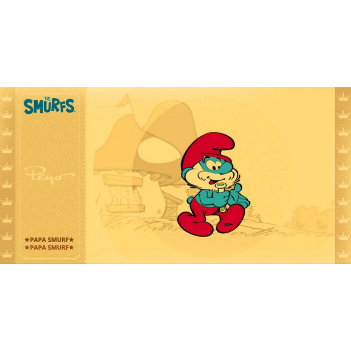 Billet de collection CK Les Schtroumpfs: Grand Schtroumpf. Produit officiel, édition limitée par Cartoon Kingdom. Chaque ticket est soigneusement imprimé en Haute Définition sur du papier PVC indéchirable, lavable et recouvert d'une fine couche de dorure très brillante. Dimensions : 14,5x7,5cm.