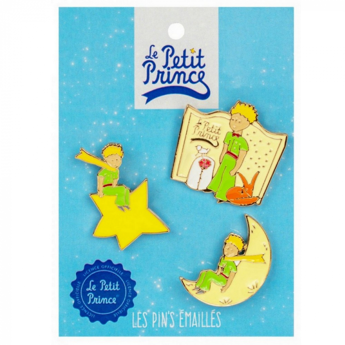 Set de 3 pins émaillés à l'effigie du Petit Prince. D'après les dessins originaux d'Antoine de Saint-Exupéry. Produit sous licence officielle du Petit Prince. Étoile, Lune, Livre.
