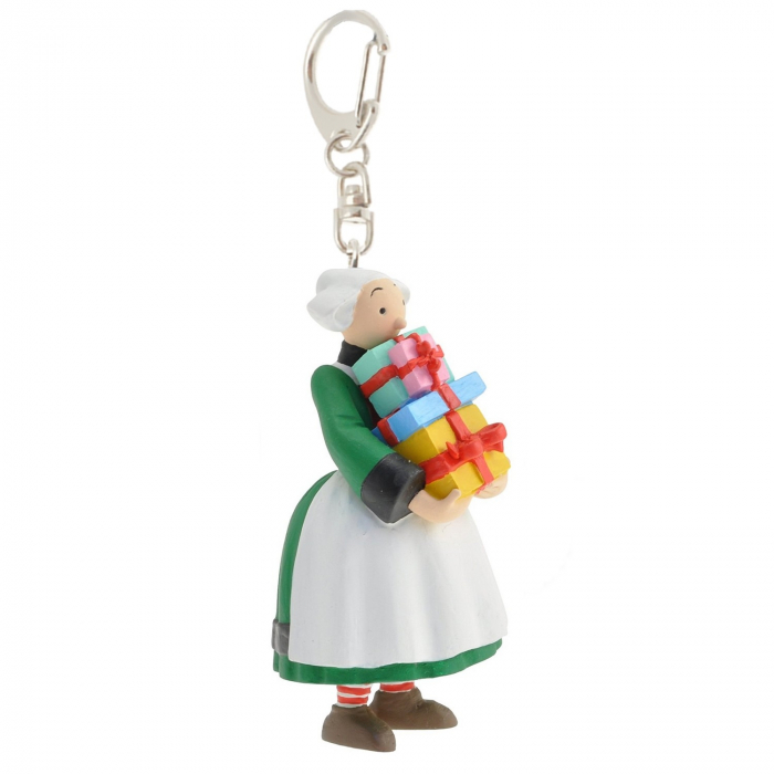 Porte-clés figurine Plastoy en PVC: Bécassine tenant une pile de cadeaux. Hauteur de la figurine: 8cm.