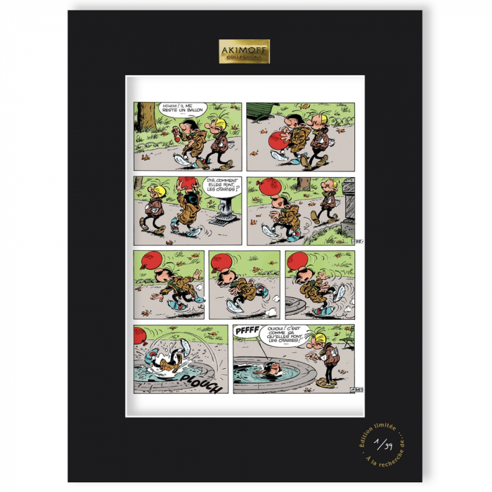 Cette affiche offset d'art dérivée de la bande dessinée de Gaston Lagaffe par Franquin est imprimée sur un papier d'art Conquéror Connoisseur 100% coton / 315g. Chaque exemplaire est encadré dans une Marie-Louise noire ornée d’une plaque en étain Akimoff. Edition limitée et numérotée à 99 exemplaires. Dimensions: 30x40cm. Les otaries.