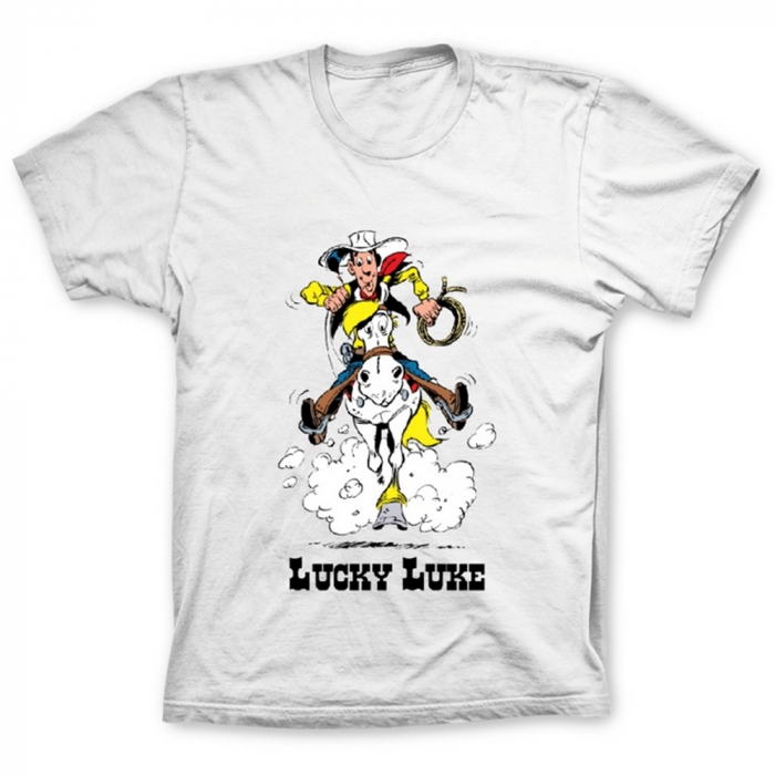 Ce t-shirt représente Lucky Luke au galop avec Jolly Jumper. Coupe parfaite et sérigraphie de haute qualité au look rétro. Couleur Blanc.