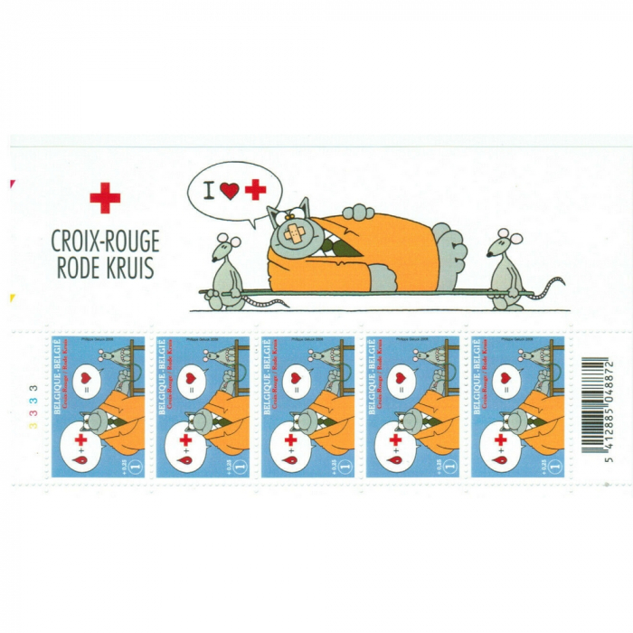 Bloc feuillet de Belgique, émis en 2008 par La Poste Belge, feuillet de 5 timbres Le Chat en hommage à la Croix Rouge.