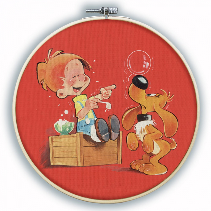Un canevas illustré monté en cerceau bambou d'après l'œuvre de Jean Roba. Les aventures familiales de Boule, âgé de 7 ans et de Bill, son chien plus que fidèle !