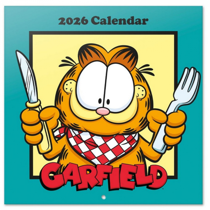 2026 Wall calendar Erik Garfield Staple binding, includes 12 images inside and 5mm hole to hang on the wall. Includes poster. 250g paper and 150g gloss lamination on the cover and inside. Dimensions: 30x30cm. 6 languages: English, Spanish, French, German, Italian and Portuguese. 12 months from january to december 2026.