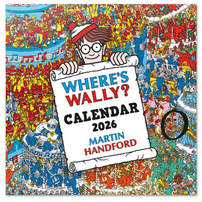 2026 Wall calendar Erik Where's Wally?. Staple binding, includes 12 images inside and 5mm hole to hang on the wall. Includes poster. 250g paper and 150g gloss lamination on the cover and inside. Dimensions: 30x30cm. 6 languages: English, Spanish, French, German, Italian and Portuguese. 12 months from january to december 2026.