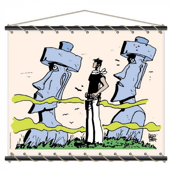 Corto Maltese cotton stretched canvas poster, Easter Island. Includes a cord to hang it on the wall. Wood mounting, the cord is hemp-colored. Delivered in a canvas bag with the visual of the panel. Handcrafted in France. Dimensions 140x115cm.
