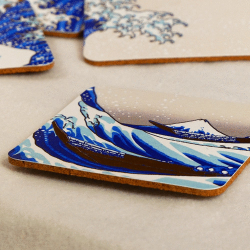 Set of 4 coasters, Katsushika Hokusai: The Great Wave off Kanagawa. Elegant and durable, they protect your table with artistic flair. High quality and easy to clean. Bring a touch of Japanese masterpiece to your home decor! Dimensions: 10x10xm.