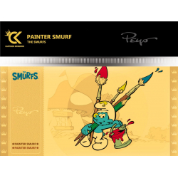 Smurfs Golden Ticket: Smurf artist painter. Official product, limited edition by Cartoon Kingdom. Each ticket is carefully printed in High Definition on tear-proof, washable PVC paper and covered with a thin layer of high-gloss gold. Dimensions: 14,5x7,5cm.
