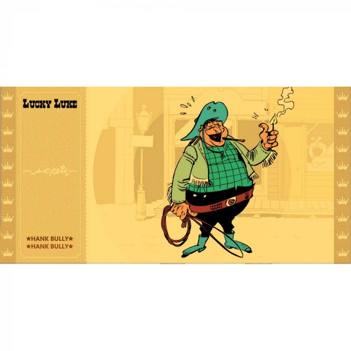 Lucky Luke Golden Ticket: Hank Bully. Official product, limited edition by Cartoon Kingdom. Each ticket is carefully printed in High Definition on tear-proof, washable PVC paper and covered with a thin layer of high-gloss gold. Dimensions: 14,5x7,5cm.