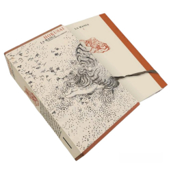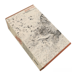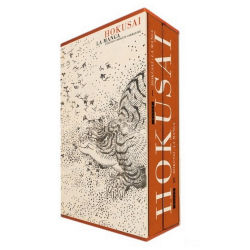 The slipcase offers a real showcase for the two works. It features a reproduction of the work "Running Tiger, Hashiru tora" by Hokusai and is offered with an orange canvas at the head and foot of the box. The title and the drawing on the back "Self-portrait at the age of eighty-three by Katsushika Hokusai" are reproduced in orange metallic gilding. This same gilded drawing is reproduced on the cover of each volume.