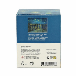 Scented candle, Vincent van Gogh: The Starry Night. 185g of mineral and vegetable wax, cotton wick and Cotton flower fragrance. Made in France. 100% recyclable packaging and glass.