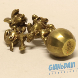 Collectible bronze figurine by Pixi The acrobatic Smurfs. Limited edition and numbered 100 copies with certificate of authenticity. Exclusivity Gian & Davi Collezioni. Wooden box. Height: 19,4cm.