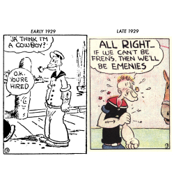 Popeye the Sailor Man is a fictional cartoon character created by Elzie Crisler Segar. The character first appeared on January 17, 1929, in the daily King Features comic strip Thimble Theatre. The strip was in its tenth year when Popeye made his debut, but the one-eyed sailor quickly became the lead character, and Thimble Theatre became one of King Features' most popular properties during the 1930s. After Segar died in 1938, Thimble Theatre was continued by several writers and artists, most notably Segar's assistant Bud Sagendorf. It was formally renamed Popeye. The strip continues to appear in first-run instalments on Sundays, written and drawn by R.K. Milholland. The daily strips are reprints of old Sagendorf stories.