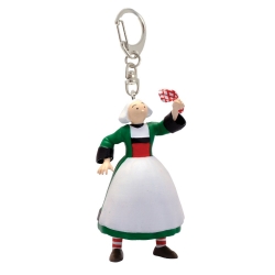 Keychain figurine from Plastoy: Bécassine wearing a green dress pastiching traditional Breton, with her pancake stove.
