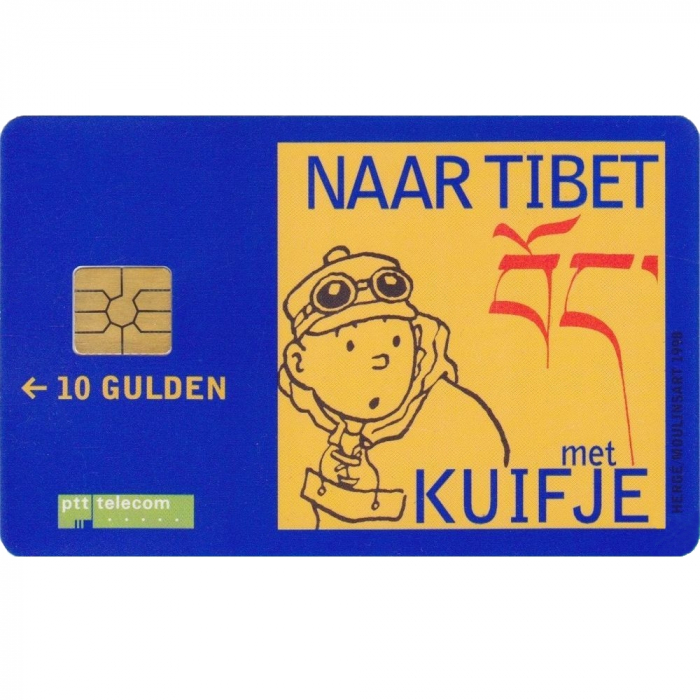 Real Phone Card Hergé Tintin, PTT Telecom Naar Tibet met Kuifje. Delivered in a printed cardboard booklet, with a landscape format, that opens like a book. Limited edition and numbered 1500 copies. Edited by the Rijksmuseum voor Volkenkunde in Leiden (Netherlands) on the occasion of the exhibition Naar Tibet met Kuifje which took place in 1997.
