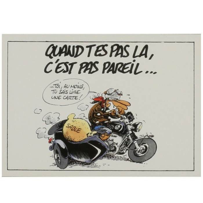 Collectible postcard published by the Lucane company in 1996, Bar2 Fane Joe Bar Team: Quand t’es pas là, c’est pas pareil… Toi au moins tu sais lire une carte ! Dimensions: 10x15cm.