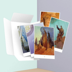 Set of 18 Postcards Moebius, Paradiso. Written by Dante Alighieri in the 14th century, engraved by Gustave Doré in the 19th century... and redesigned by Mœbius at the dawn of the second millennium, Paradise (The Divine Comedy) is offered to you in 18 magnificent illustrations. Dimensions of each postcard: 10x15cm.
