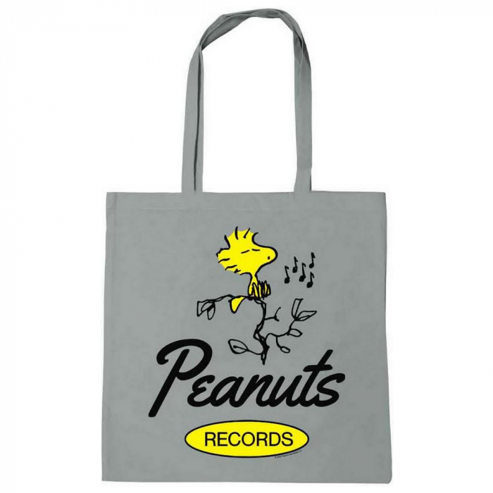 Logoshirt® cotton canvas bag Peanuts, Snoopy: Woodstock Records, Grey. The bag is Oeko-Tex® STANDARD 100 certified and is made of 100% high-quality, durable cotton. Dimensions: 38x42cm.