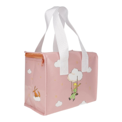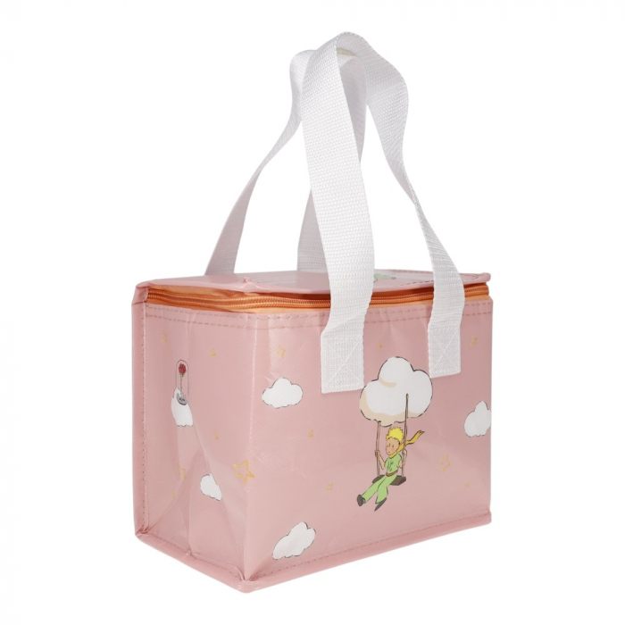 Plastic Isotherm Lunch Bag Kiub The Little Prince on a swing. The interior is aluminum while the exterior is recycled plastic. This will keep food cold or hot. It has a zipper and a fabric handle for easy carrying. Dimensions: 21,5x12x16,5cm.