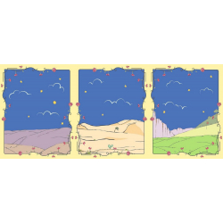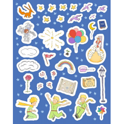 A pouch containing a large triptych poster and 3 sheets of repositionable stickers, to imagine all the adventures of the Little Prince and discover his wonderful world. Dimensions: 60x29cm.