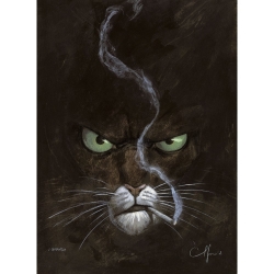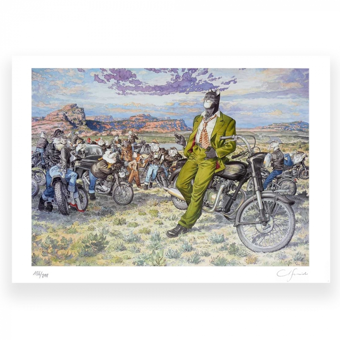 This art offset poster derived from Juanjo Guarnido's Blacksad comic book is printed on a Fedrigoni Stucco Old Mill 250g paper. 80x60cm. Amarillo's Road. Limited edition and numbered 399 copies, hand signed by Juanjo Guarnido.