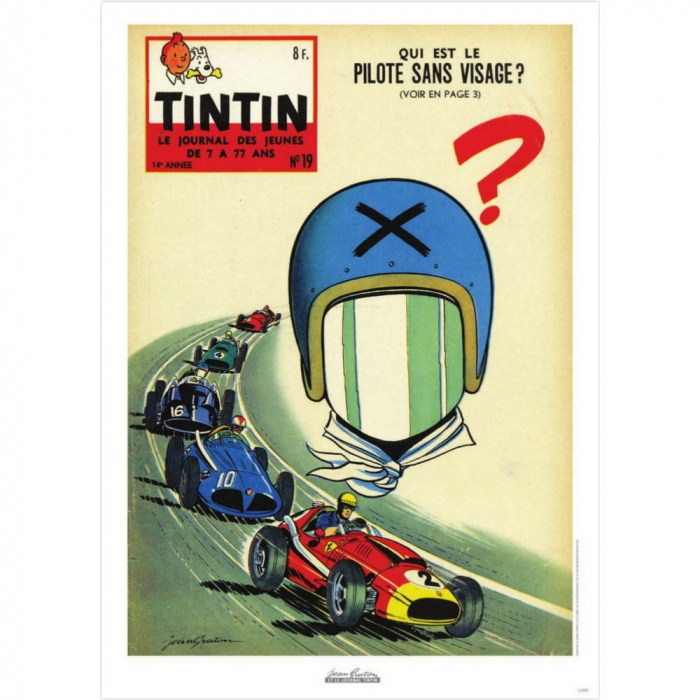 This poster represents the cover designed by Jean Graton in The Journal of Tintin 1959: Le pilote sans visage ! Nº19. Limited edition and numbered 500 copies. 50x70cm. Set of 20 postcards offered with the purchase of this cover of Jean Graton !